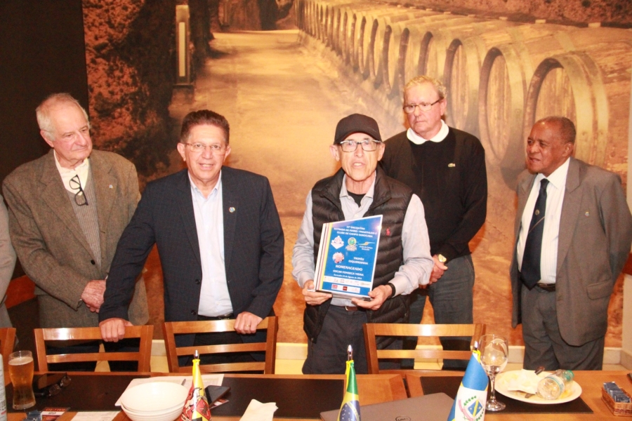 Pedro Souza, fez questão de ressaltar as figuras dos fundadores do clube, os saudosos Otto Wey Netto, Cassio Loureiro Ferrari, João Rozas Barrios e Eduardo Álvaro Vieira, além de Jair Bellucci, Doraci Sola Galera e Antonio Carlos Bramante que ainda estão aqui junto de nós frequentando o clube. Com muita emoção Pedro Souza falou do Dr. Eduardo Álvaro Vieira que era apaixonado pelo clube e que nesta noite o seu irmão e também panathleta Oscar Fonseca Vieira, que estava acompanhado da sua esposa Elizabeth Vieira e da filha Ana Luiza, recebeu o Troféu Esquerdinha, referente ao 25° Encontro Estrada de Ferro Panathlon Clube de Campo que foi realizado no sábado passado e ele não pode estar presente porque estava em um compromisso em Brasília. O troféu foi entregue pelos atletas profissionais do passado, Ademir de Barros e João Batista Abelha que jogaram no São Bento e no São Paulo Futebol Clube. Oscar falou do carinho e da alegria em ser homenageado pela sua passagem como atleta juvenil do Estrada de Ferro e como dirigente do Colégio Objetivo que tinha um projeto esportivo muito intenso, da sua passagem como vice presidente do Panathlon Club Sorocaba na gestão 2012 e 2013 e que continua no clube até hoje mesmo não tendo frequentado seus convívios, comprometeu em voltar a frequentar, lembrou também o quanto foi importante o Panahtlon para o seu irmão Eduardo Vieira.