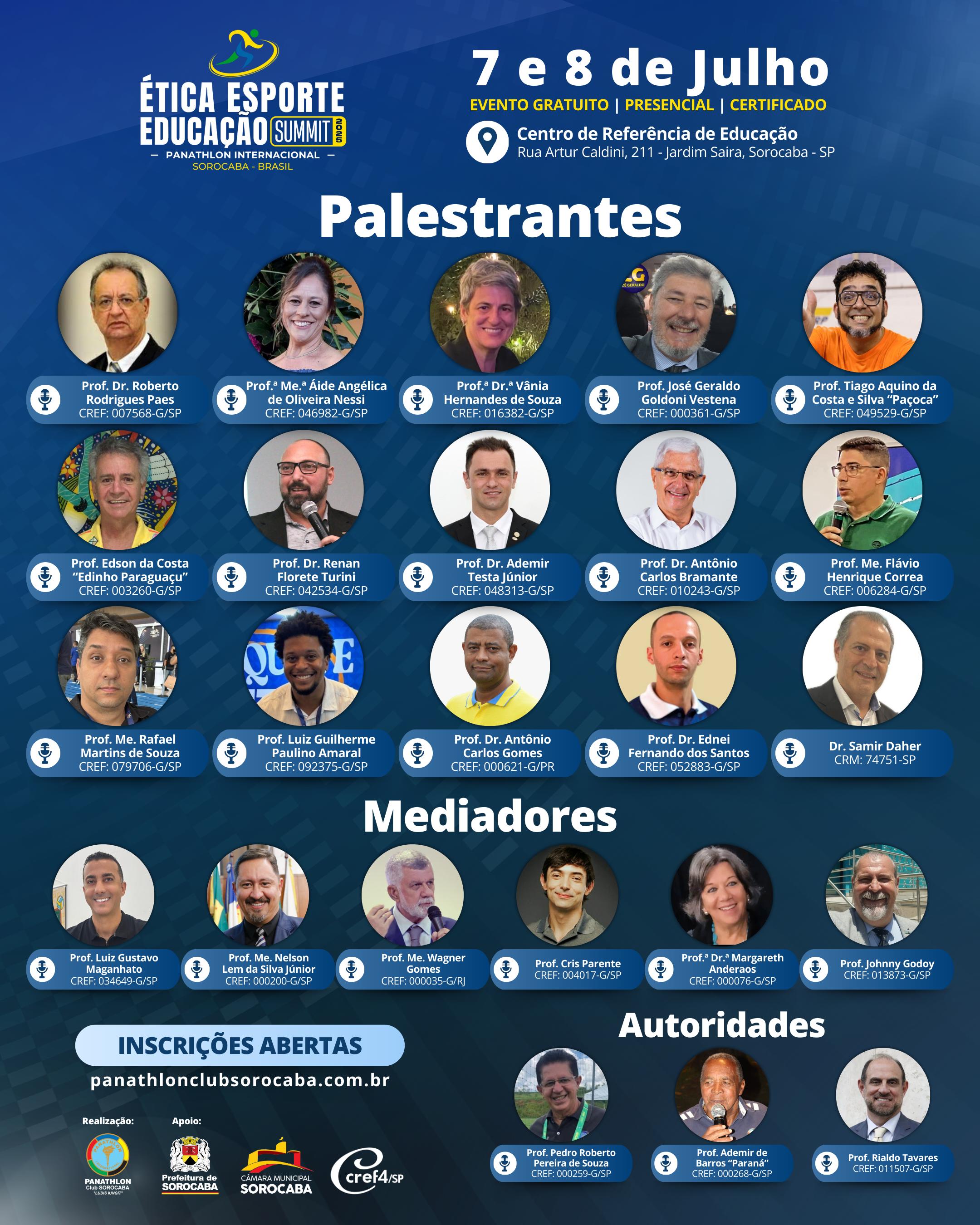 As palestras serão ministradas por profissionais de notório saber e especialistas na área da Educação Física, do Esporte Escolar, da Saúde e da Qualidade de Vida.