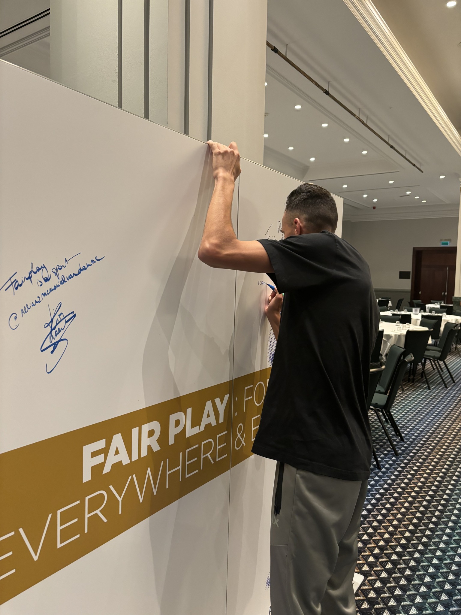 Ce mur, installé dans le ballroom de l'hôtel où résident les athlètes du Mémorial, les invite à y apposer leur signature, symbolisant le respect et l'intégrité dans le sport, à l'instar de Soufiane ELbakkali, champion du 3 000 m steeple.