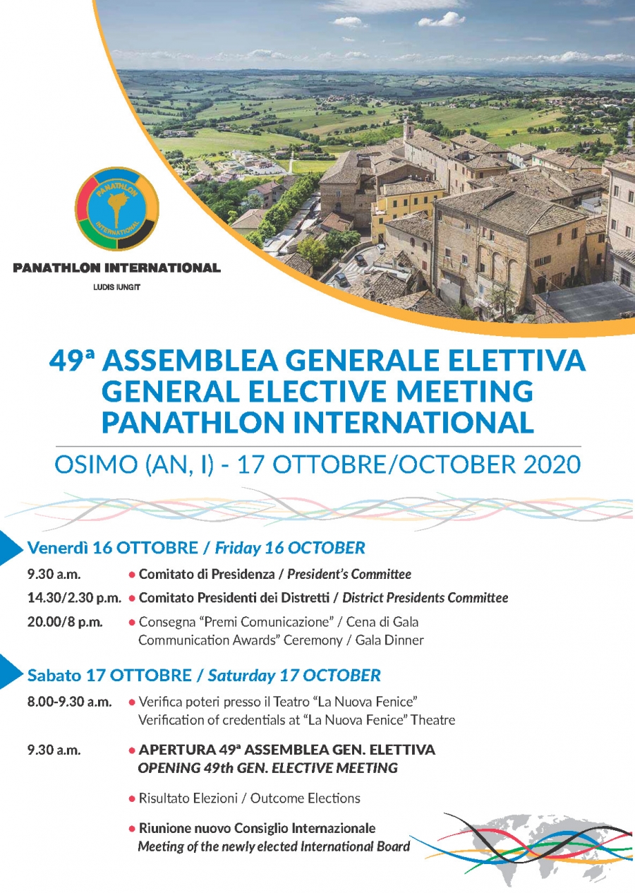 Saturday, October 17, 2020 from 9.30 AM (Rome) will be held at the Theatre "La nuova Fenice" in Osimo (AN) the 49th Elective Meeting of Panathlon International.