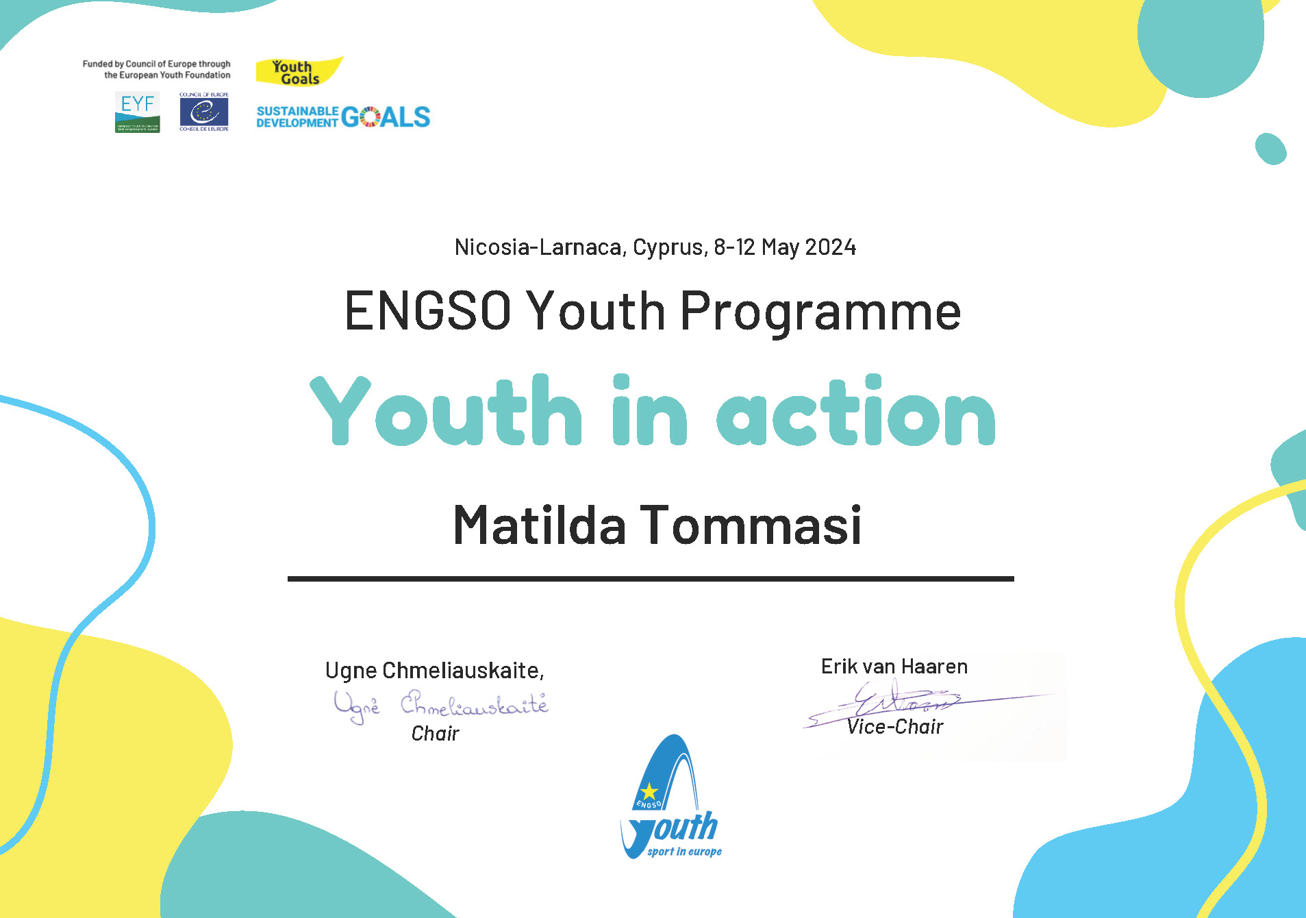 Del 8 al 12 de mayo, Larnaca (Chipre) acogió el curso de formación internacional "Juventud en Acción", organizado por ENGSO Youth. El acto reunió a 25 jóvenes representantes, entre ellos Matilda Tommasi, Presidenta del Panathlon Club Junior Trieste Muggia, en representación de Panathlon International. La iniciativa, apoyada por el Consejo de Europa a través de la Fundación Europea de la Juventud, tenía como objetivo promover la participación significativa y efectiva de los jóvenes en las organizaciones deportivas.
