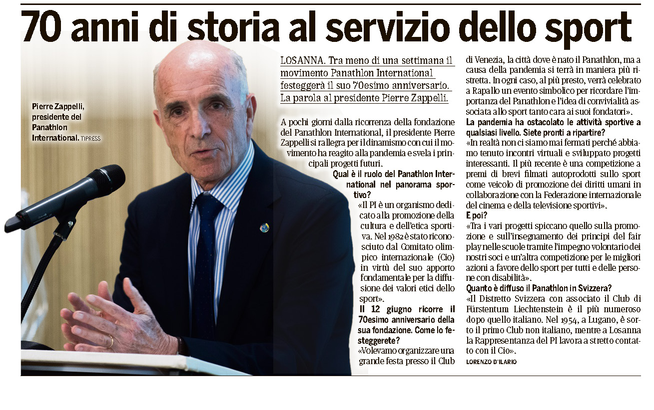 Intervista di Lorenzo D'Ilario (Addetto Stampa del Panathlon Club di Roma) al Presidente Pierre Zappelli pubblicata sul quotidiano ticinese "20 Minuti"