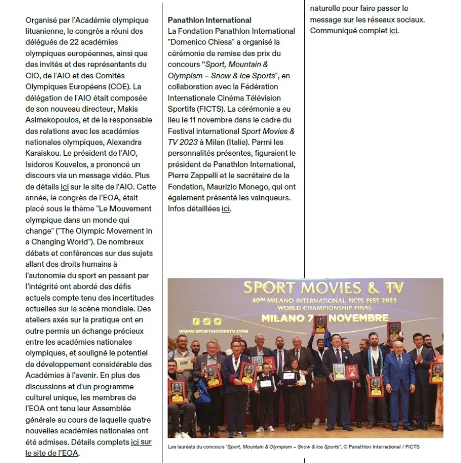 Sull’ultimo notiziario del CIO è stata pubblicata la notizia della premiazione dell’International Video Competition “Sport, Montain & Olympism- Snow & Ice Sports” promosso da Panathlon International - Fondazione PI – D. Chiesa e FICTS.