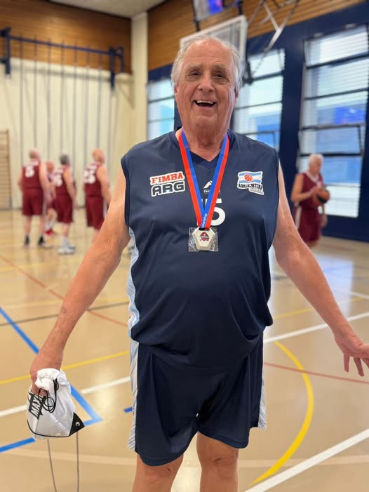 (Jorge Minuto Presidente del Panathlon Distrito Argentina e integrante del Seleccionado Argentino de Maxibásketball + 80, orgulloso de recibir su primera medalla mundialista )