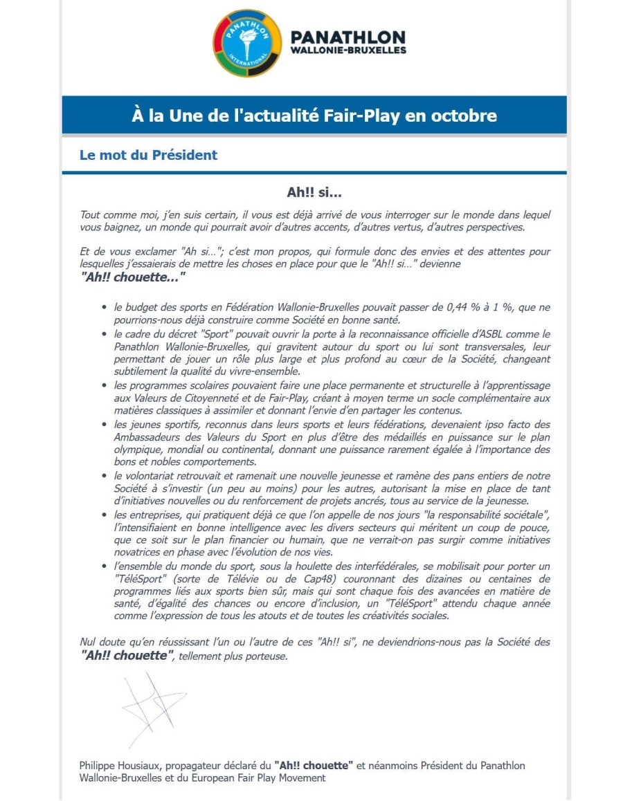 Panathlon International Club Wallonie-Bruxelles - Newsletter Octobre 2024