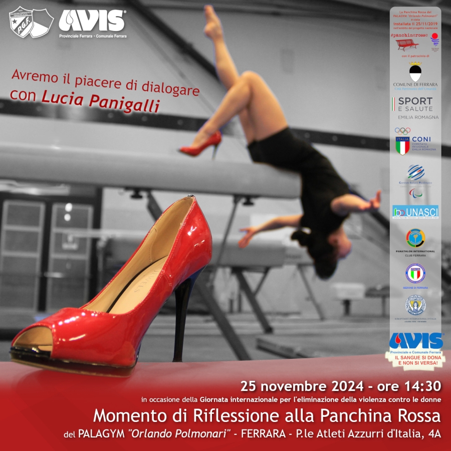 Lunedì 25 novembre, in occasione della Giornata internazionale per l'eliminazione della violenza contro le donne, torna alle 14:30 il momento di riflessione alla Panchina Rossa del PALAGYM “Orlando Polmonari”, organizzato da Palestra Ginnastica Ferrara e AVIS Provinciale e Comunale di Ferrara.