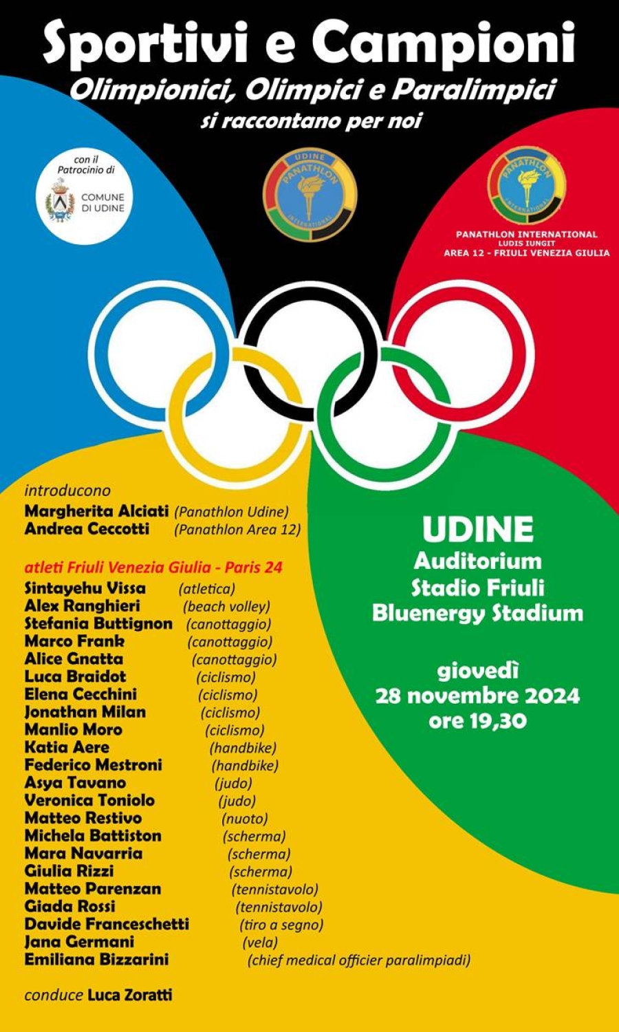Giovedì 28 novembre alle ore 19,30 presso l’Auditorium dello Stadio Friuli di Udine, il Panathlon Club Udine incontrerà gli atleti “parigini” nella tradizionale conviviale, un incontro che per l’occasione vede la partecipazione riunita degli altri Club della regione ed il sostegno del Governatore Area 12 del Panathlon International.