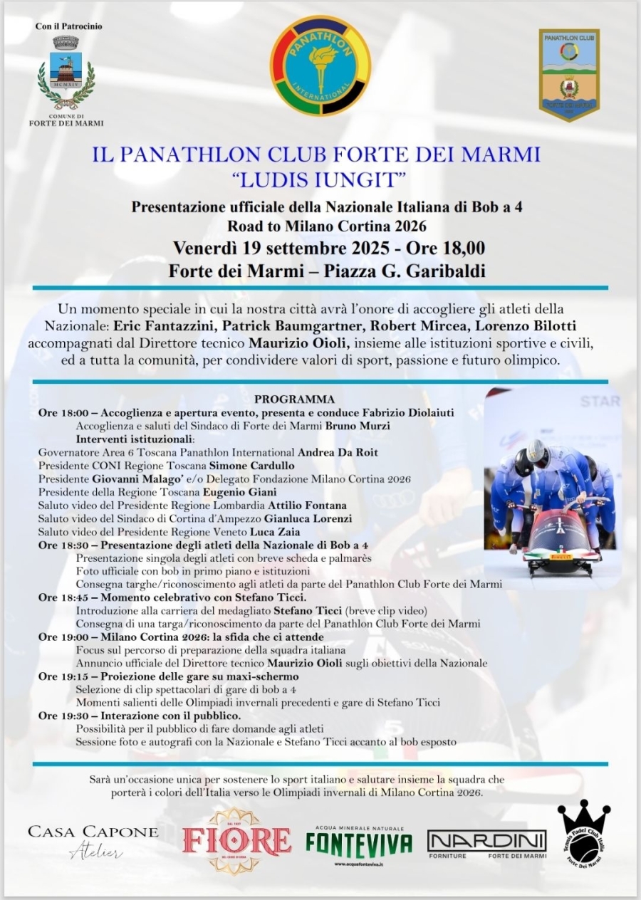 Un momento particolare sarà quello con Stefano Ticci, cittadino di Forte dei Marmi e figura di riferimento del bob italiano, che riceverà un riconoscimento ufficiale dal Panathlon Club per la sua lunga carriera e per l’impegno profuso nello sviluppo di questo sport.