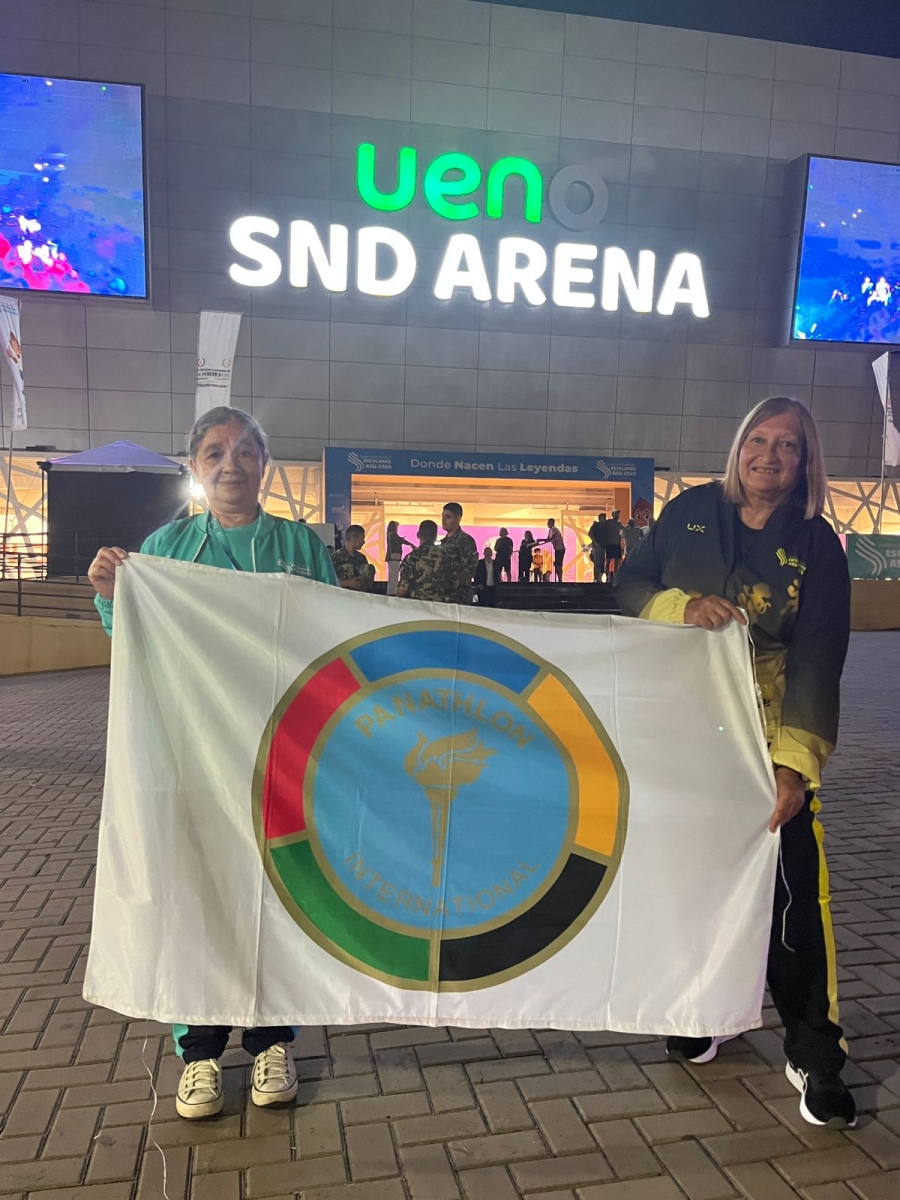 La panathleta del Club PBZona Norte Liliana, llevando orgullosa la bandera del panathlon en los Juegos Suramericanos Escolares de Atletismo y Paratletismo, ella como Oficial internacional que se realizan en Asunción, Paraguay