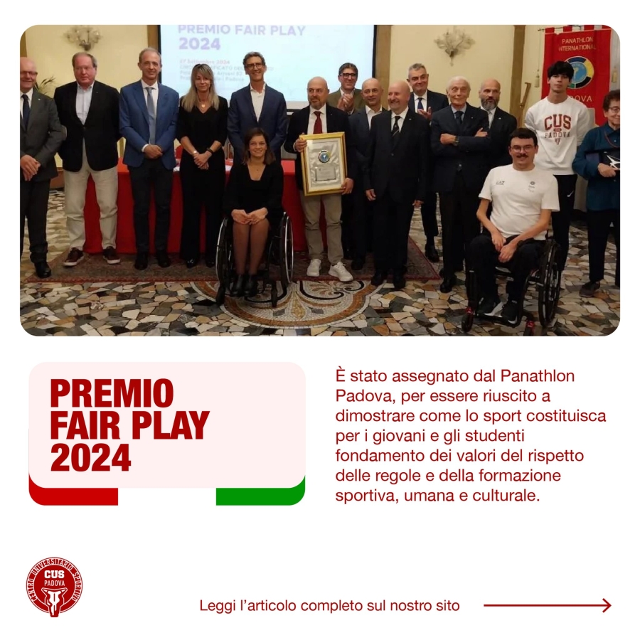 Il Panathlon Padova, l'organismo riconosciuto dal Comitato olimpico internazionale che si propone di approfondire, divulgare e difendere i valori dello sport, ha consegnato al CUS Padova il Premio Fair Play 2024. A ricevere con grande orgoglio il riconoscimento è stato lo stesso presidente Francesco Uguagliati che venerdì 27 settembre ha partecipato alla cerimonia a Palazzo Zacco Armeni, sede del circolo ufficiali di Padova, alla presenza delle autorità civili, accademiche e sportive.