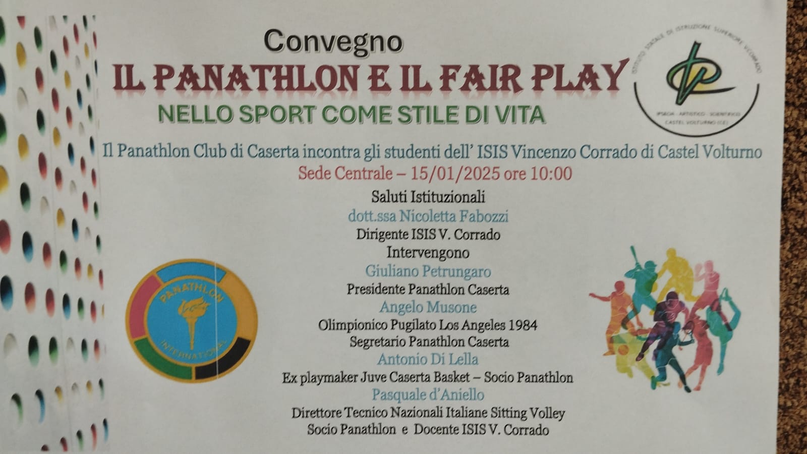 15 gennaio - Il Panathlon Club di Caserta ha organizzato un convegno dal titolo "Il Panathlon e il fair play" presso l'ISIS Vincenzo Corrado di Castel Volturno, incontrando gli studenti per promuovere i valori etici dello sport, condividendo le esperienze di campioni per illustrare comportamenti corretti come il rispetto delle regole, la lealtà e la dignità nella vittoria e nella sconfitta, in linea con la Carta del Fair Play del Panathlon.
