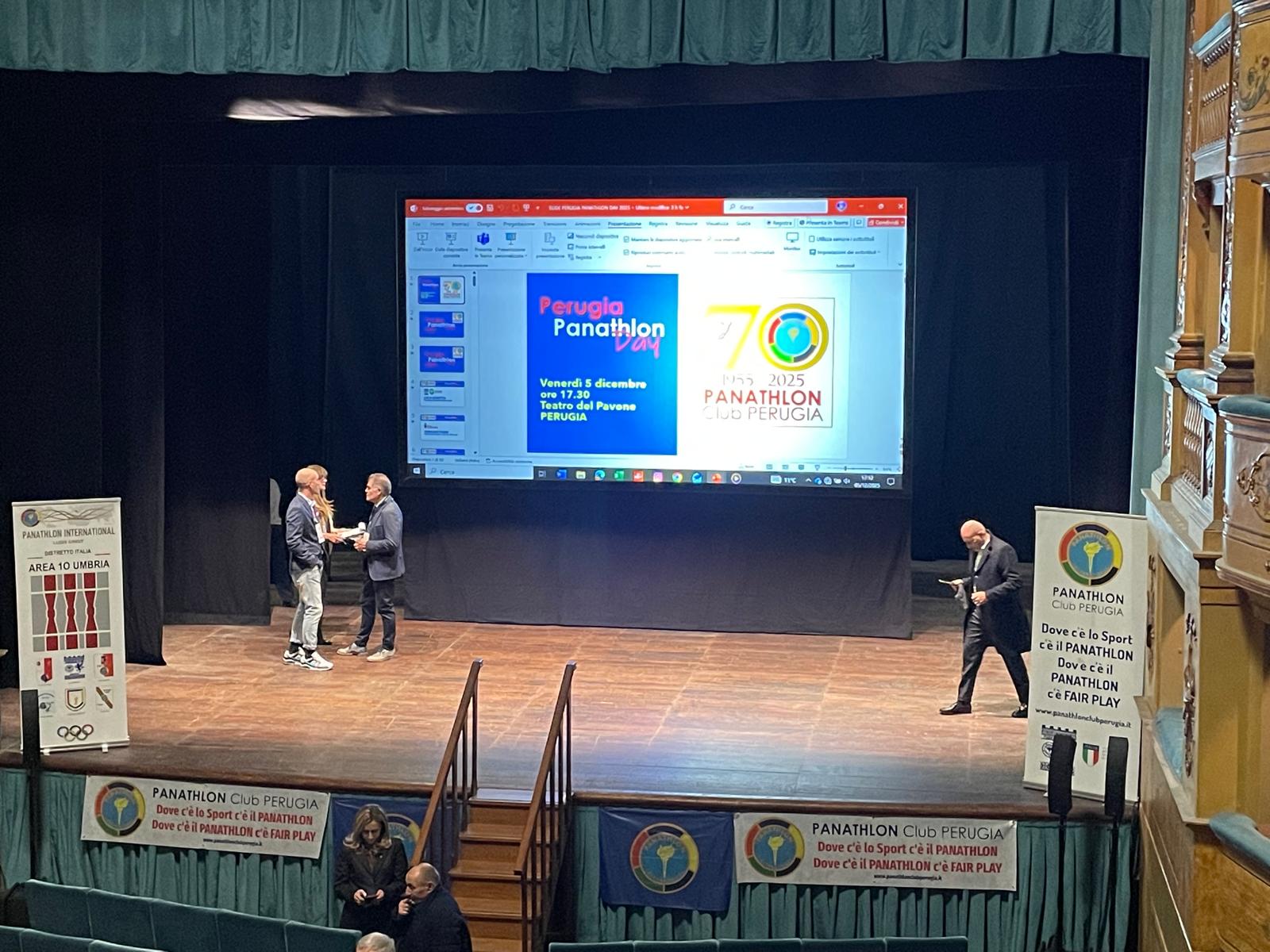 (Perugia) Da un teatro della periferia è salita al centralissimo Teatro del Pavone a Perugia la seconda edizione del “Panathlon Day 2025” organizzata dal Panathlon Club Perugia che proprio in questo giorno, 5 dicembre, festeggia i suoi primi 70 anni di attività. Sul palcoscenico di un affollatissimo teatro in tutti gli ordini di posti, Paola Costantini e Luca Ginetto, presidente del Club, a scandire i nomi degli ospiti e dei premiati. Ospiti di riguardo gli assessori allo sport del comune di Perugia, Pierluigi Vossi, e della Regione, Simona Meloni, il presidente della Provincia di Perugia Massimiliano Presciutti, il Questore di Perugia Dario Sallustio, la delegata del CONI on. Francesca Cristiana Lancellotta, il Presidente del Panathlon International Giorgio Chinellato, il direttore generale di Fondazione Perugia Fabrizio Stazi e alcuni dei past presidenti del club: Mario Provvidenza, Marcello Carattoli (attuale Governatore Area X Umbria), e Alessio Burini. Erano presenti anche Marco Paciarolo, presidente CIP Umbria e Riccardo Giubilei, Commissario CONI Umbria e Presidente Nazionale Triathlon.