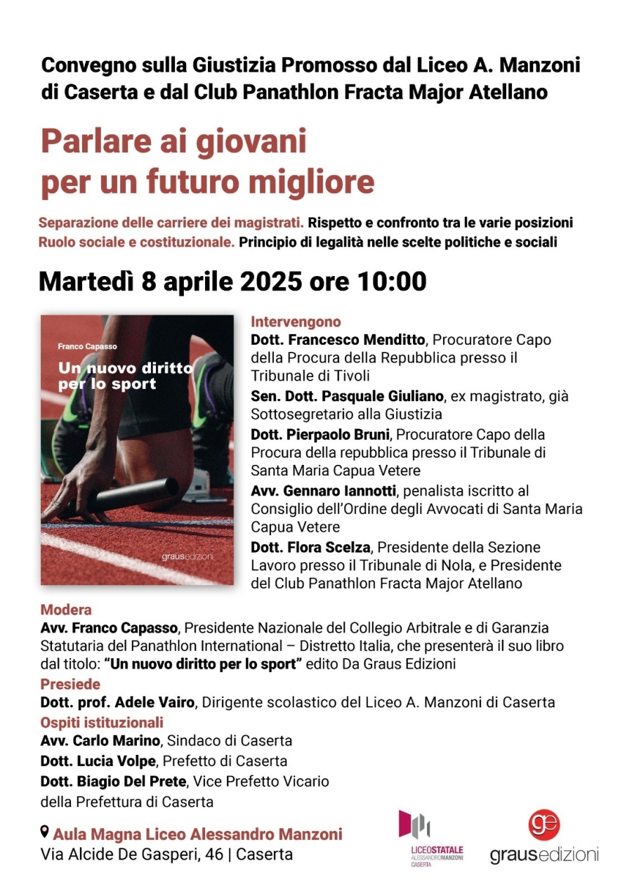 Il Liceo Manzoni di Caserta e il Panathlon Club Fracta Major Atellano organizzano martedi 8 aprile un Convegno sul tema "Parlare ai giovani per un futuro migliore: separazione delle carriere dei magistrati"