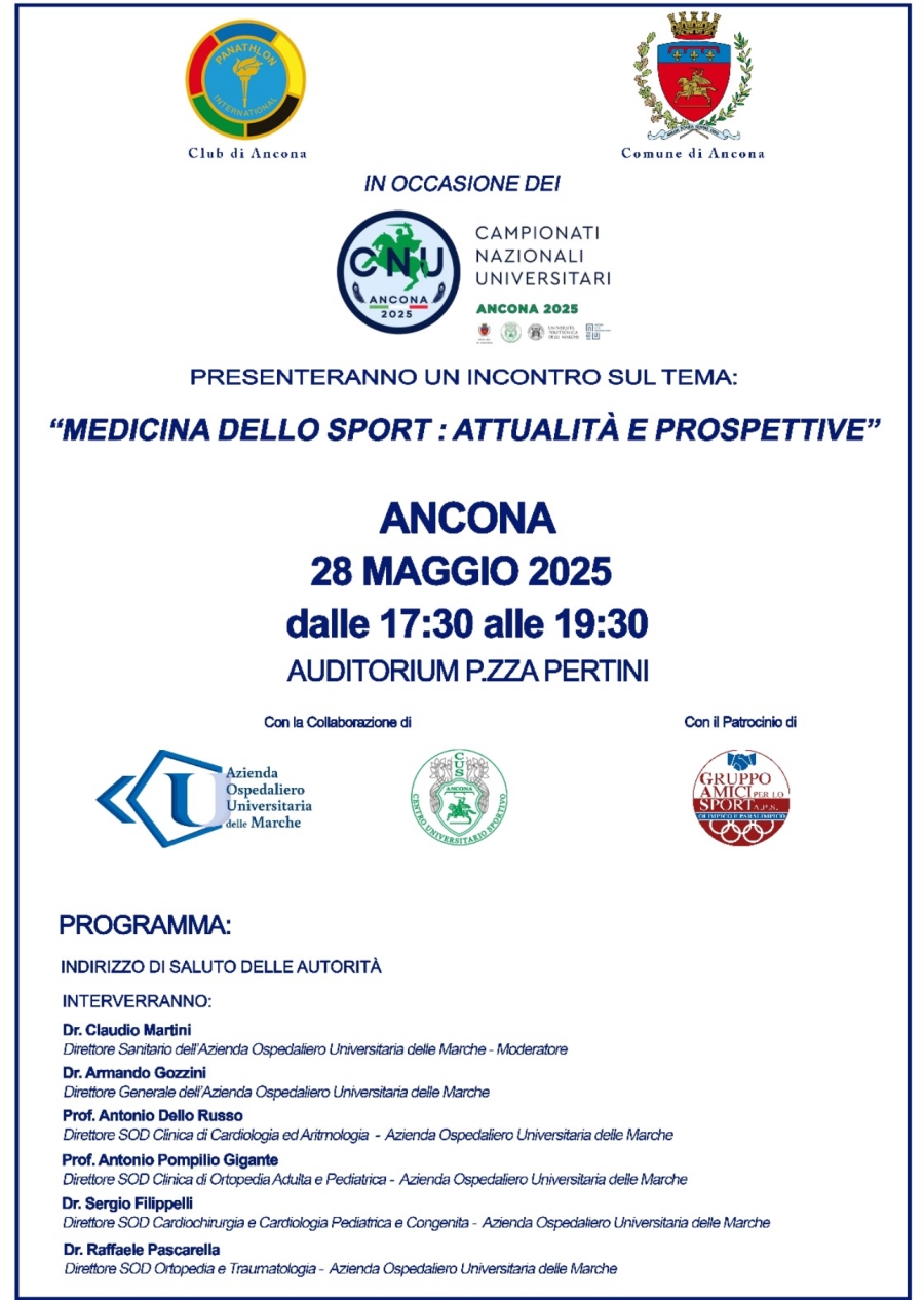 In occasione dei campionati italiani universitari che si terranno ad Ancona dal 24 maggio al 1 giugno tra gli eventi collaterali il Panathlon Club Di Ancona ed il Comune di Ancona organizzano un interessante convegno, aperto alla cittadinanza, per mercoledì 28 maggio, ore 17,30, presso l’auditorium di piazza Pertini, con la presenza di importanti relatori. Il tema del convegno è “Medicina dello sport: attualità e prospettive” sulla scia anche della prossima istituzione di un corso di laurea di questo argomento presso l’Università Politecnica delle Marche. Nutrito e qualificato, come ricordato, il novero degli interventi sulla materia. Ci saranno, infatti il Dr. Claudio Martini, Direttore Sanitario dell’Azienda Ospedaliera Universitaria delle Marche, in veste di moderatore, e il Dr Armando Gozzini, Direttore Generale della stessa Azienda Ospedaliero Universitaria delle Marche. Ma, soprattutto, ci saranno gli interventi di quattro eccellenze della medicina sportiva, e non solo, che operano all’interno dell’Azienda Ospedaliera, che ha anno ottenuto risultati importanti nelle loro branchie di azione. Si tratta del Prof. Antonio Dello Russo, Direttore Sod Clinica di Cardiologia ed Aritmologia; del prof. Antonio Pompilio Gigante, Direttore Sod Clinica di Ortopedia Adulta e Pediatrica; del dr. Sergio Filippelli, Direttore Sod Cardiochirurgia Pediatrica e Congenita e del Dr. Raffaele Pasquarella, Direttore Sod Ortopedia e Traumatologia. Quattro luminari in campo scientifico e medico in grado di fare il punto dell’attualità e dell’evoluzione della medicina.