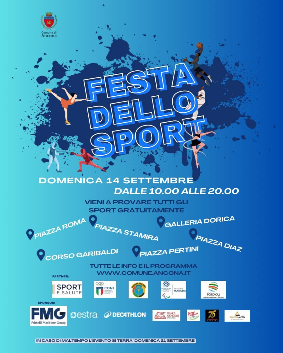 Domenica 14 settembre Ancona ospiterà la terza edizione della Festa dello Sport, che si svolgerà nel cuore della città. Dopo il successo degli scorsi anni, le associazioni sportive cittadine che contribuiscono socialmente alla crescita dello sport nel territorio, si ritrovano per la grande kermesse che mira a promuovere le varie discipline e i valori di cui la pratica sportiva è portatrice tra i giovani e giovanissimi della città. La manifestazione è realizzata con il supporto e la collaborazione di CONI Marche, Sport e Salute Marche, CIP Marche, Panathlon Club, FairPlay.