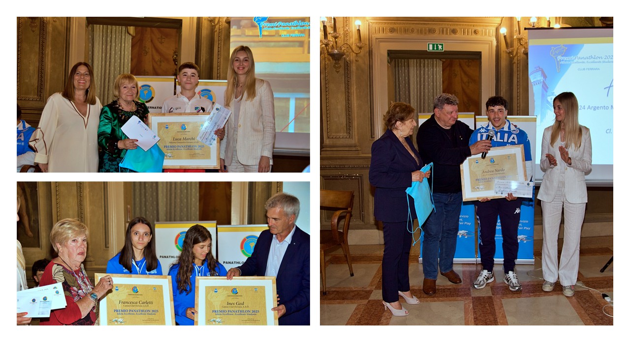 Il Panathlon Club Ferrara celebra ancora una volta il binomio scuola-sport con uno dei suoi momenti più importanti, quello dedicato ai Premi Panathlon “Atleta Eccellente – Eccellente Studente”. Lo fa in grande stile, con una serata intensa nelle sale di Palazzo Roverella, alla presenza di numerose autorità, civili e sportive, nonché della rappresentanza del Panathlon Club Modena. La presenza degli amici emiliani è presto spiegata: durante la cerimonia si è rinnovato il gemellaggio sportivo, firmato dalle Presidenti modenese Maria Carafoli e ferrarese Luciana Boschetti Pareschi, un accordo di partnership portato avanti da Rita Minarelli, e “benedetto” dal Presidente Panathlon International Giorgio Chinellato, presente in video, e dal Governatore dell’Area 5 Emilia-Romagna e Marche Stefano Ripanti. A lui anche il compito di consegnare una speciale benemerenza al decano del Club Renzo Guerrini, socio da 50 anni e per questo insignito.