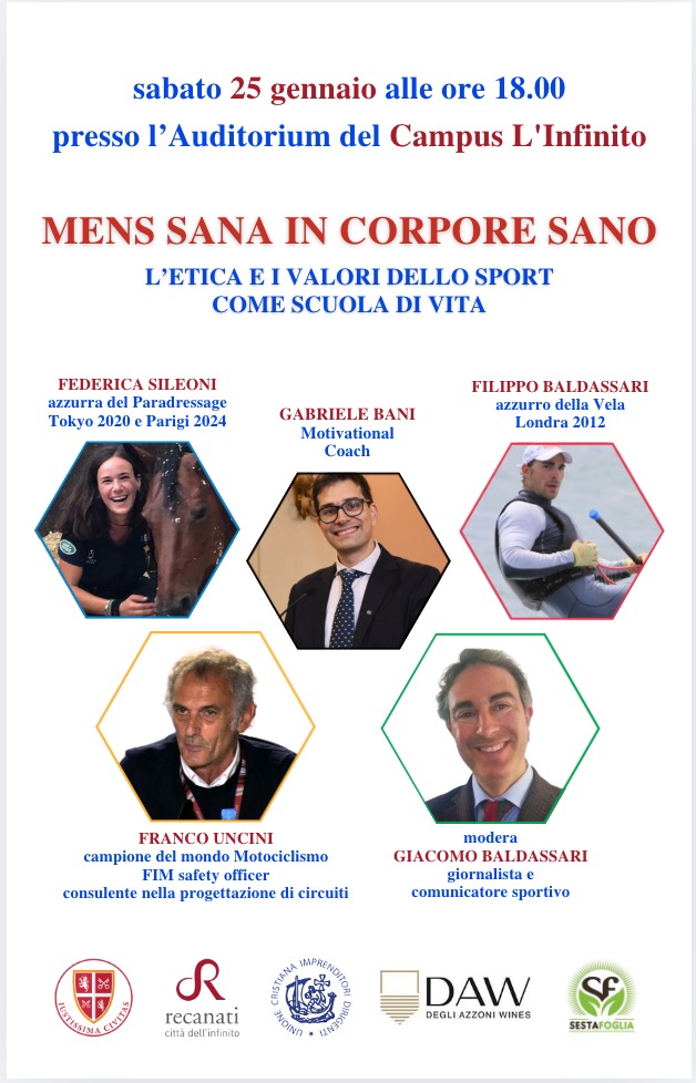 Atmosfere a cinque cerchi all'incontro "Mens sana in corpore sano - L'etica e i valori dello sport come scuola di vita", organizzato dalla Associazione Iustissima Civitas con i patrocini del Comune di Recanati e Ucid (Unione Cristiana Imprenditori Dirigenti) Macerata, sabato 25 gennaio alle ore 18 all'Auditorium del Campus L'Infinito.